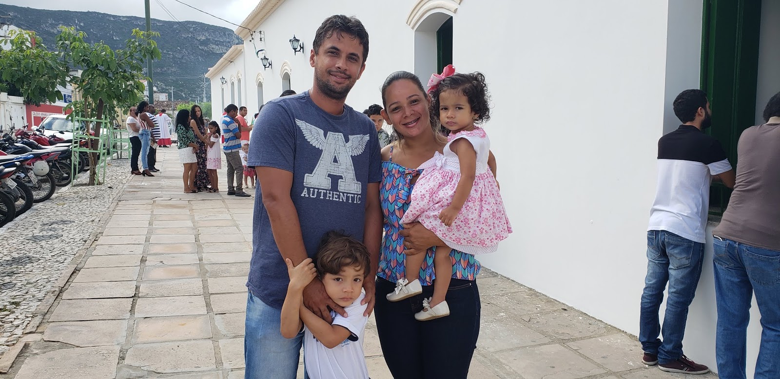 Manhã de domingo, 14 de abril de 2019, e aqui na Praça Castro Alves em Jacobina, pessoas acompanham missa com os padres Alexandre Nunes e Jucimário Carvalho.