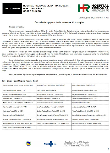 Essa Carta também segue para o órgãos competentes: Ministério Público, Conselho Regional de Medicina da Bahia e Sindicato dos Médicos da Bahia.
