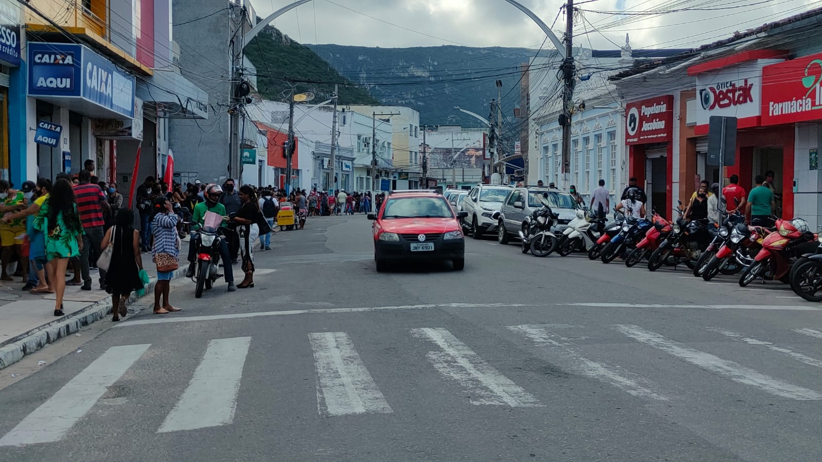 Na manhã desta sexta-feira, 25 de março de 2022, centenas de pessoas seguem em uma grande fila, do Beco da Prefeitura Municipal para a Caixa Econômica Federal na Rua Senador Pedro Lago, no centro de Jacobina.