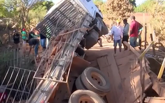 Ponte caiu após motorista de caminhão tentar passar com veículo carregado de blocos de cimento — Foto: TV Oeste |