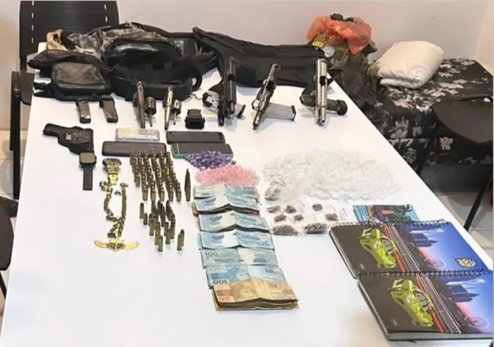 O órgão de segurança pública informou que com o quinteto foram apreendidos três pistolas calibres 9mm e 40, dois revólveres calibres 38 e 32, carregadores, munições, R$ 6,5 mil em espécie, 586 pinos de cocaína, 110 pedras de crack, 56 porções de maconha, capa de colete balístico, uma balança e cadernos com anotações do comércio de drogas.