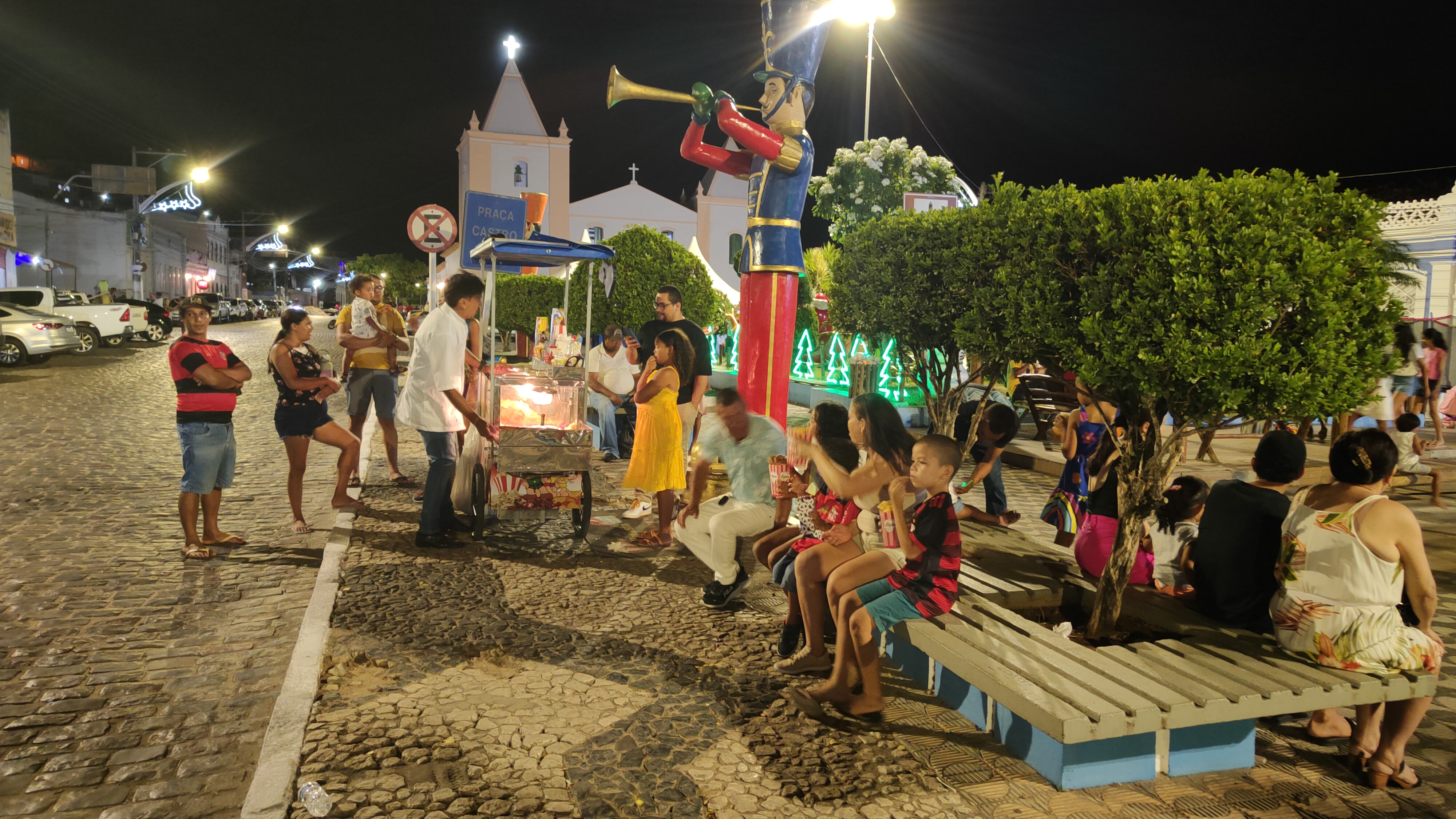Noite de domingo, 10 de dezembro de 2023, e aqui na Praça Castro Alves em Jacobina, pessoas acompanham missa com o padre José Vieira.